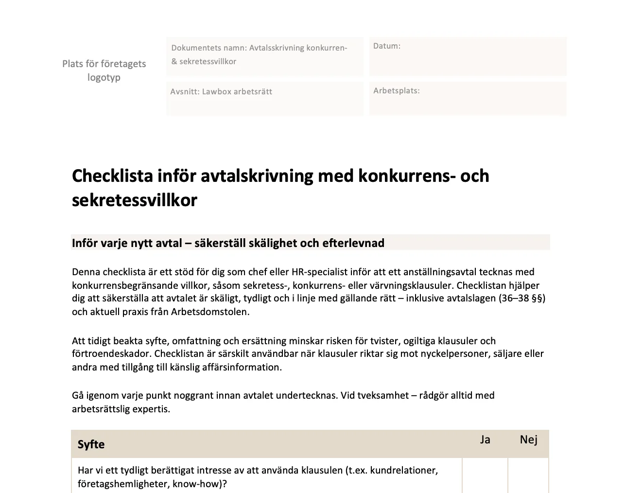 Checklistan hjälper arbetsgivaren att bedöma om klausulen har ett berättigat affärsskydd, om den är proportionerligt avgränsad i tid, geografi och verksamhetsområde, samt att säkerställa att eventuell ersättning under spärrtiden är korrekt angiven och rimlig. Den är särskilt användbar vid avtal med nyckelpersoner eller medarbetare som har tillgång till affärskritisk information.