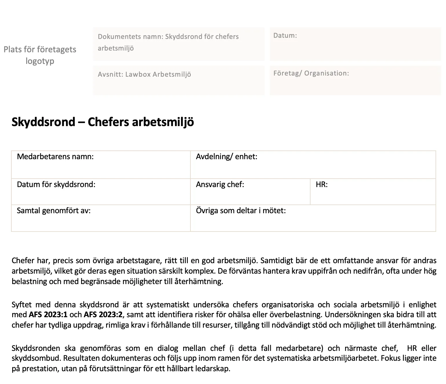 Denna enkät för en skyddsrond för chefers arbetsmiljö är ett strukturerat verktyg som stödjer organisationer i att systematiskt undersöka och förbättra de organisatoriska och sociala arbetsförhållandena för chefer. Enkäten är utformad i enlighet med Arbetsmiljöverkets föreskrifter (AFS 2023:1 och AFS 2023:2) och fokuserar på centrala områden såsom arbetsbelastning, mål och stöd, arbetstid och återhämtning samt psykosocial arbetsmiljö.
