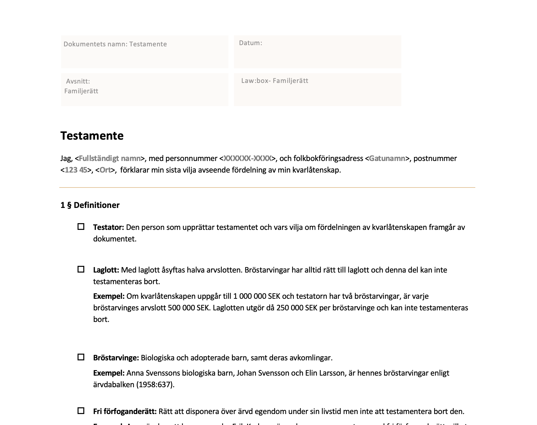 Denna mall för testamente är en lättanvänd mall framtagen för privatpersoner som vill uttrycka sin sista vilja kring fördelning av egendom efter sin bortgång. Mallen följer svensk arvsrätt enligt ärvdabalken (1958:637) och inkluderar tydliga instruktioner, begreppsförklaringar och exempel som gör det enkelt att förstå och fylla i dokumentet på egen hand.